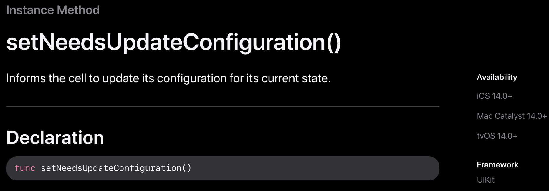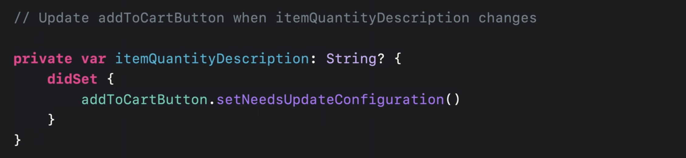 이는 itemQuantityDescription 프로퍼티의 didSet handler가 configurationUpdateHandler를 부르는 setNeedsUpdateCongifuration 인스턴스 메서드를 실행하기 때문에 가능하다.
