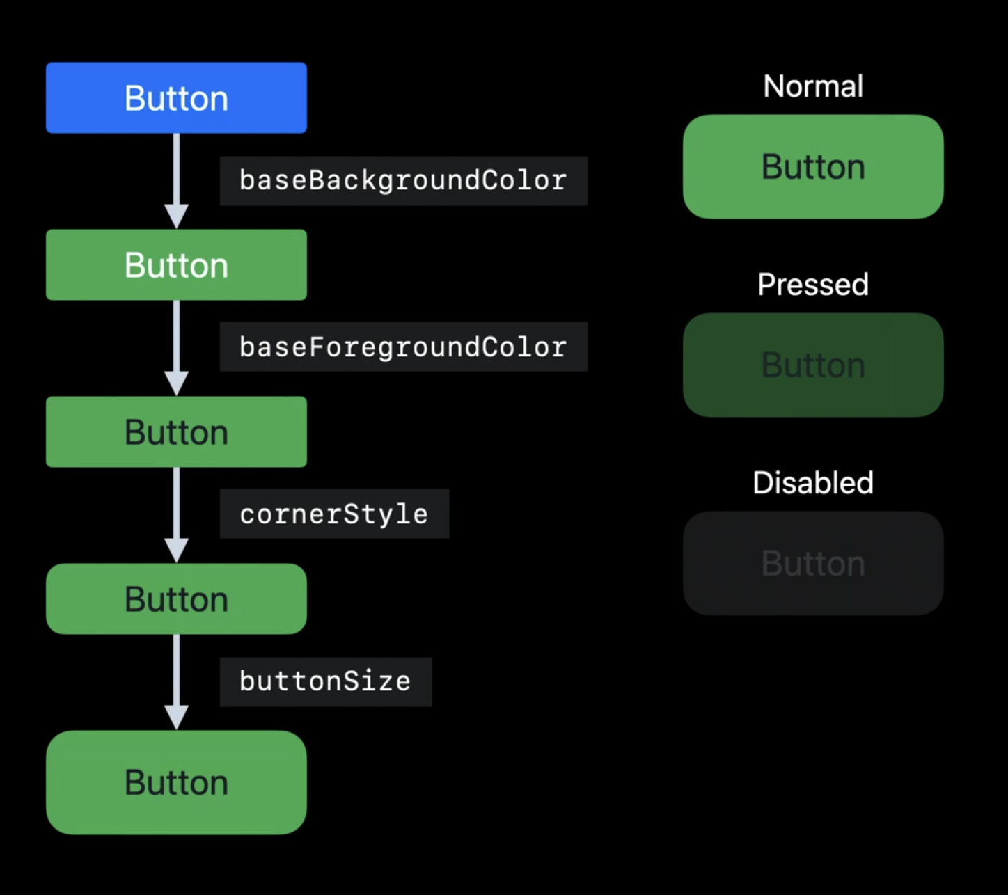 기존에 버튼을 customize하기 위해선 baseBackgroundColor, baseForegroundColor, cornerStyle, buttonSize를 차례로 수행함으로써 가능했지만, 지금은 Normal, Pressed, Disabled 형태에 따라 간단히 customize 할 수 있다.
