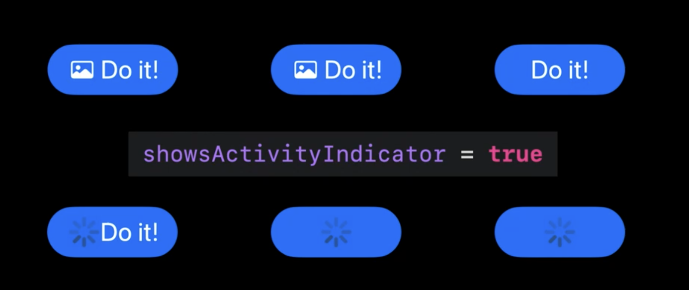 우리는 showsActivityIndicator를 true로 만들어줌으로써 버튼에 activity indicator를 추가하고, 앱 사용자에게 현재 무언가 바쁘게 일어나고 있음을 알릴 수 있다.