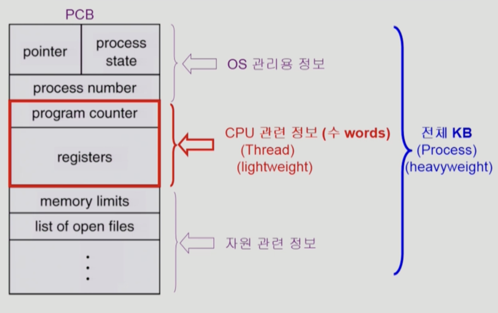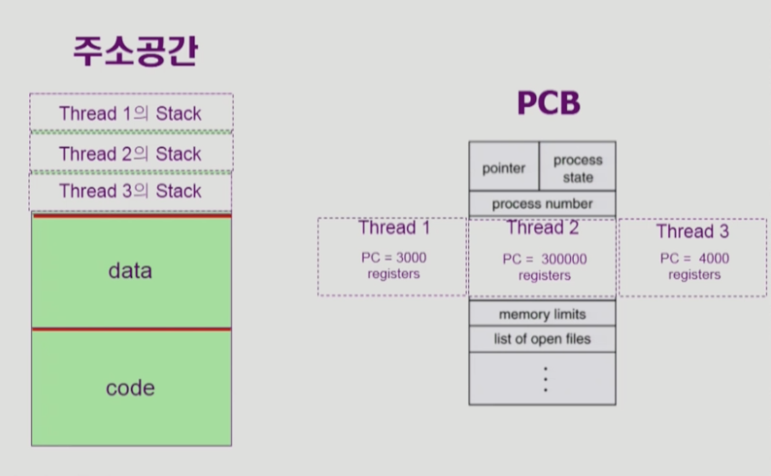 프로세스 안에 쓰레드가 여러 개 있으면 CPU 수행과 관련된 정보들(program counter, registers)만 각각 쓰레드마다 별도의 copy를 갖는다.