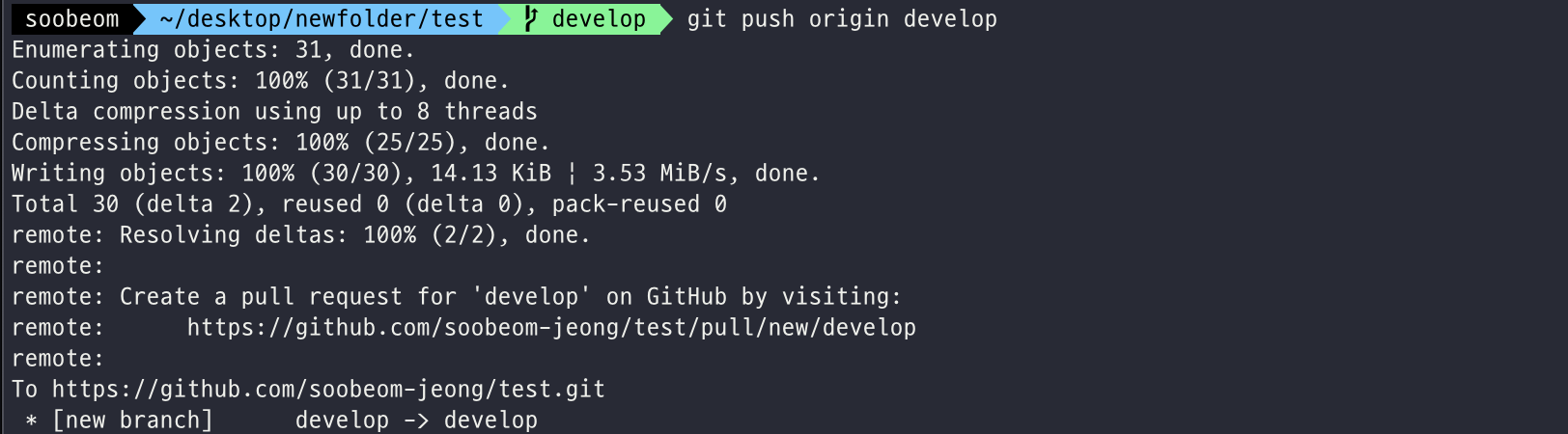 마지막으로 origin develop(원격 저장소의 develop 브랜치)에 push 합니다.
