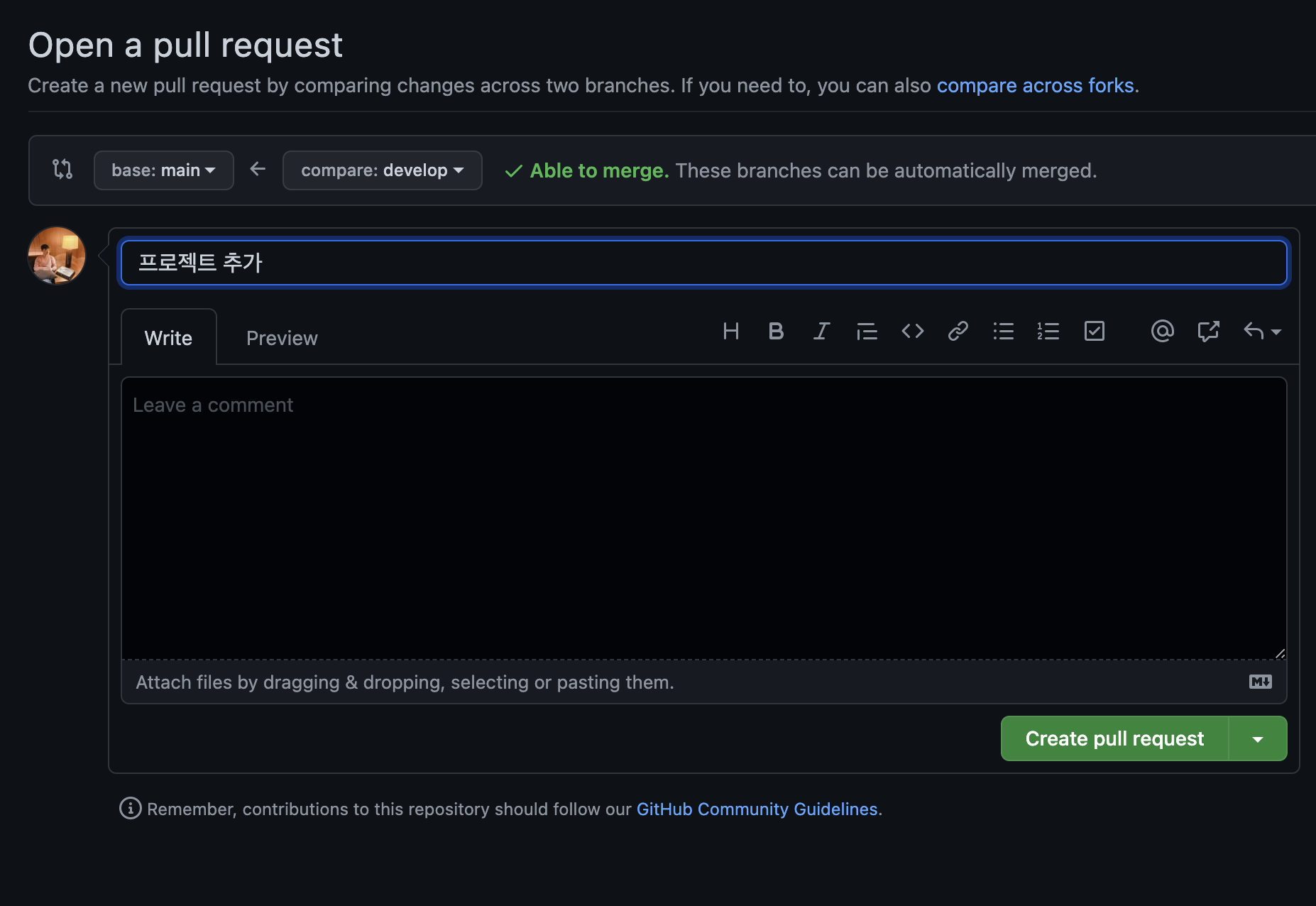 버튼을 누르고 내용을 작성 후 Create pull request 합니다.