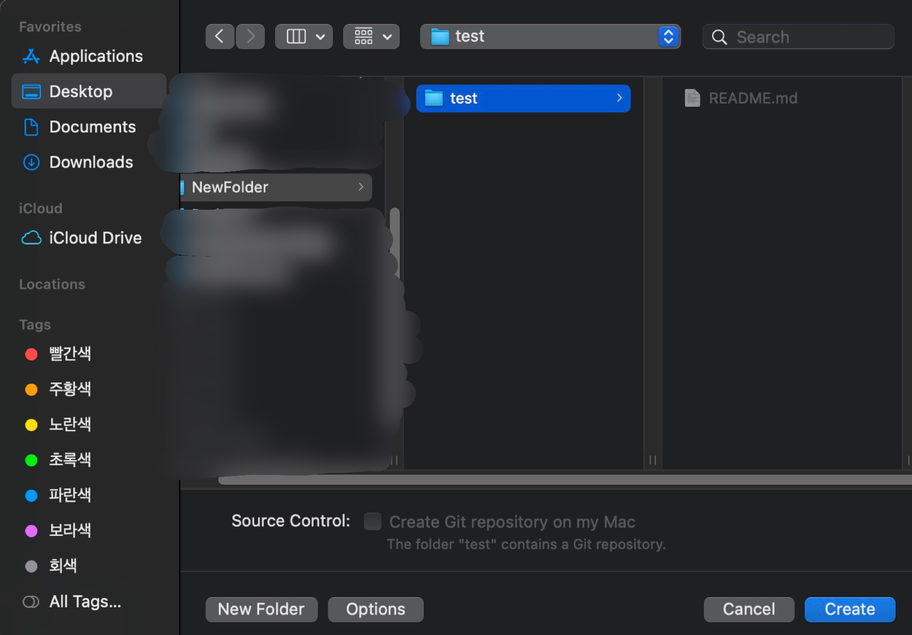 클론한 test 폴더 안에 맨 처음 만들었던 README.md 파일과, 방금 만든 Xcode 프로젝트 폴더인 test 폴더가 잘 들어가 있음을 확인할 수 있습니다.