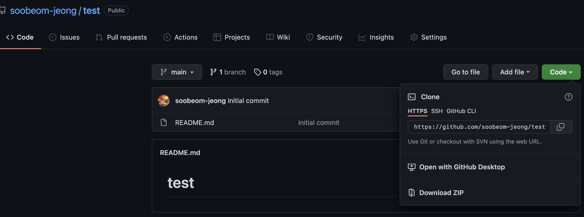 프로젝트 폴더와 README.md 파일이 들어있는 test 폴더로 이동합니다.