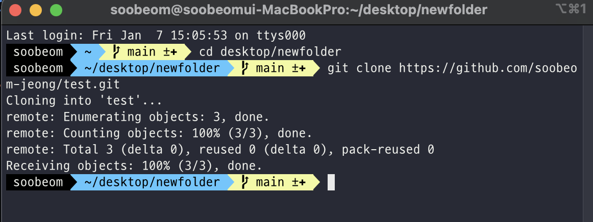 레파지토리를 받아올 폴더의 위치로 이동합니다. 저는 desktop에 newfolder라는 새로운 폴더를 하나 미리 생성했습니다.