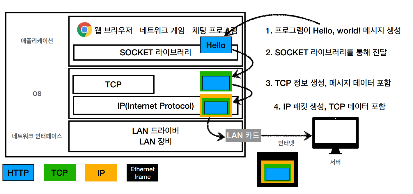 클라이언트와 서버는 수많은 노드로 연결된 복잡한 인터넷 망을 통해서 서로 메세지를 전송한다.