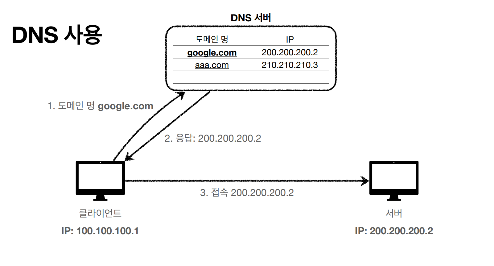 클라이언트가 DNS 서버에 원하는 도메인 명의 IP 주소를 요청하면 이를 DNS 서버에서 응답해주고, 해당 IP 주소를 통해 서버에 접속한다.