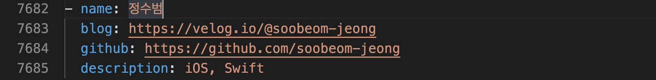 수많은 사람들의 목록이 보일텐데, 이름 순으로 정렬이 되어 있습니다. 따라서 본인 이름 순서에 해당하는 라인에 본인 정보를 입력해줍니다. 기본적으로 이름과 블로그 주소를 입력해주시면 되고, 추가적으로 깃허브나 기타 SNS주소를 입력하시면 됩니다.