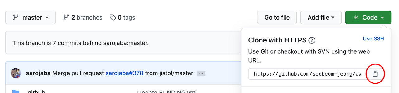 sarojaba님이 아닌 제 계정인 soobeom-jeong으로 되어있는걸 보실 수 있습니다.