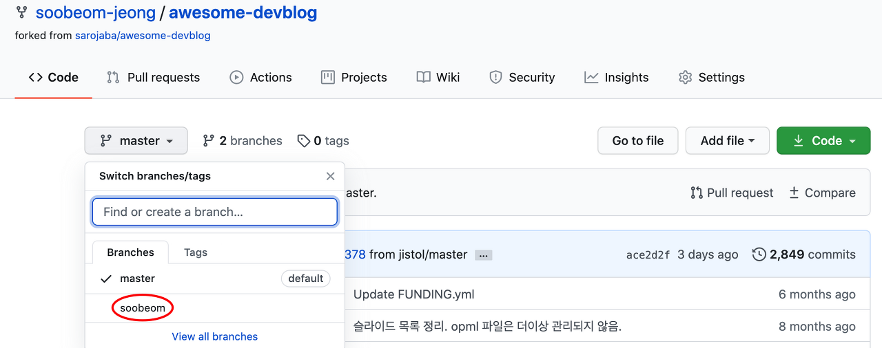 soobeom 자리에 본인이 원하는 brach 이름을 입력하시면 brach가 생성됩니다. 다시 레파지토리에 들어가서 확인해보면,