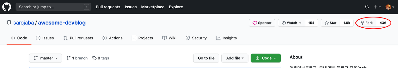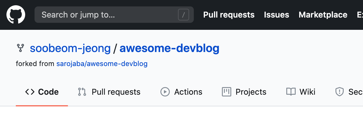 Fork를 하셨다면 본인 레파지토리에 awesome-devblog가 추가 되는데, 본인 이름으로 생성됩니다. 저같은 경우엔 다음과 같습니다.