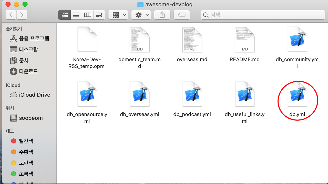 이제 클론한 awesome-devblog 폴더에 들어가시면 db.yml 이라는 파일이 있습니다.