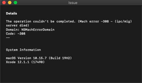 Xcode 11.7 과 12.1 버전을 모두 다운 받아 사용하던 도중에 시뮬레이터 실행 시 'Mach error -308' 라는 오류가 발생하였습니다.